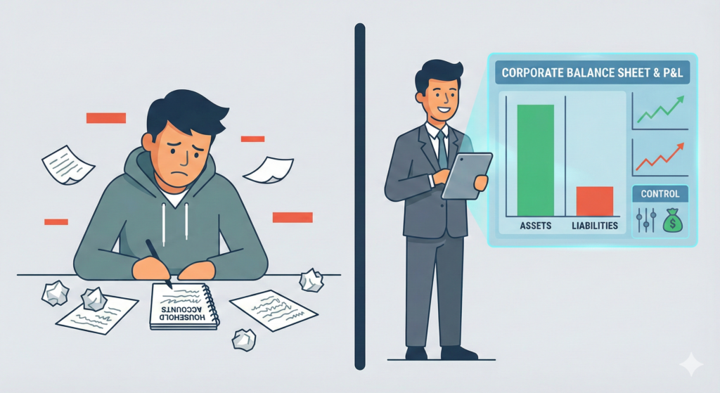 家計簿は、日々の「支出(経費)」を記録して削るためのものであり、未来の「資産」をどう築くかという視点が完全に欠落しています。
